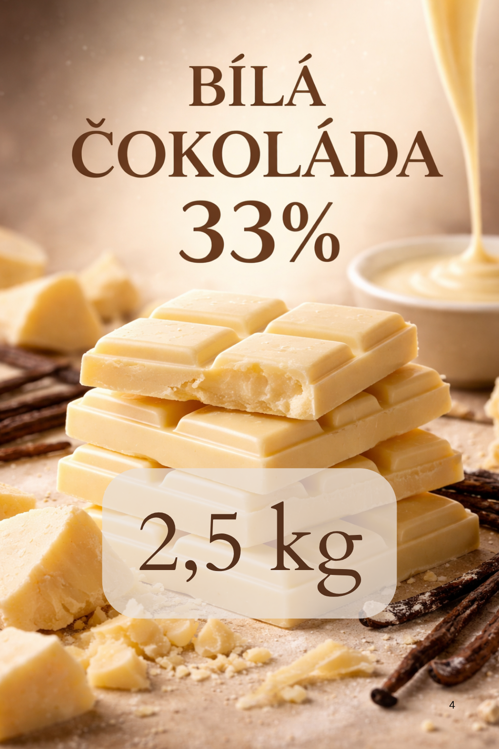 Jemná bílá čokoláda s vysokým podílem kakaového másla – méně sladká a skvělá do makronek, ganáží, tartaletek i pralinek. Tato čokoláda si vás získá díky své jemné textuře a krémové chuti.